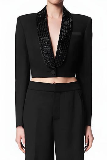 Shine bright like a diamond in this exquisite rhinestone-decorated crop blazer! Its unique hollow back design adds a playful, daring touch to any ensemble. Crafted from a comfortable non-stretch fabric, this jacket offers a sleek, tailored fit for a sophisticated look. Perfect for turning heads at your next party or special event.